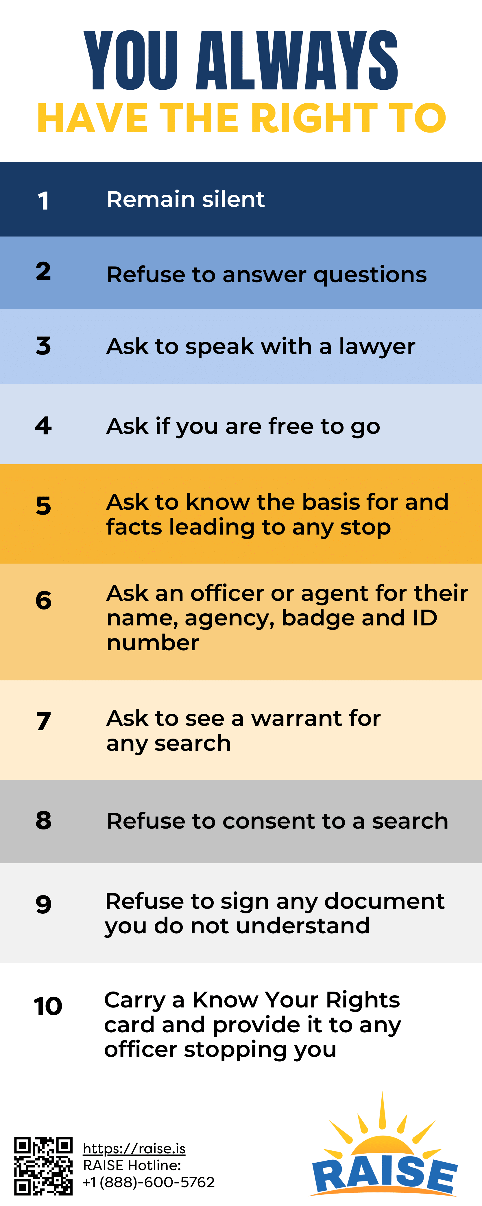 Raise - Know your rights; Raise - Resources - This is a organization based in Florida, but these two pages have great resources and knowledge available for free. Including this “Know Your Rights Card” - PDF download for printing here