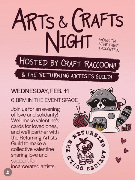 Craft Raccoon - “Craft night returns on Feb. 11 with @craftraccooncbus and special guests @thereturningartistsguild! This one is all about love & solidarity. We’ll have materials for y’all to make valentine’s cards for loved ones. We’ll also be partnering with the Returning Artists Guild to make a collective valentine sharing love and support for incarcerated artists.”