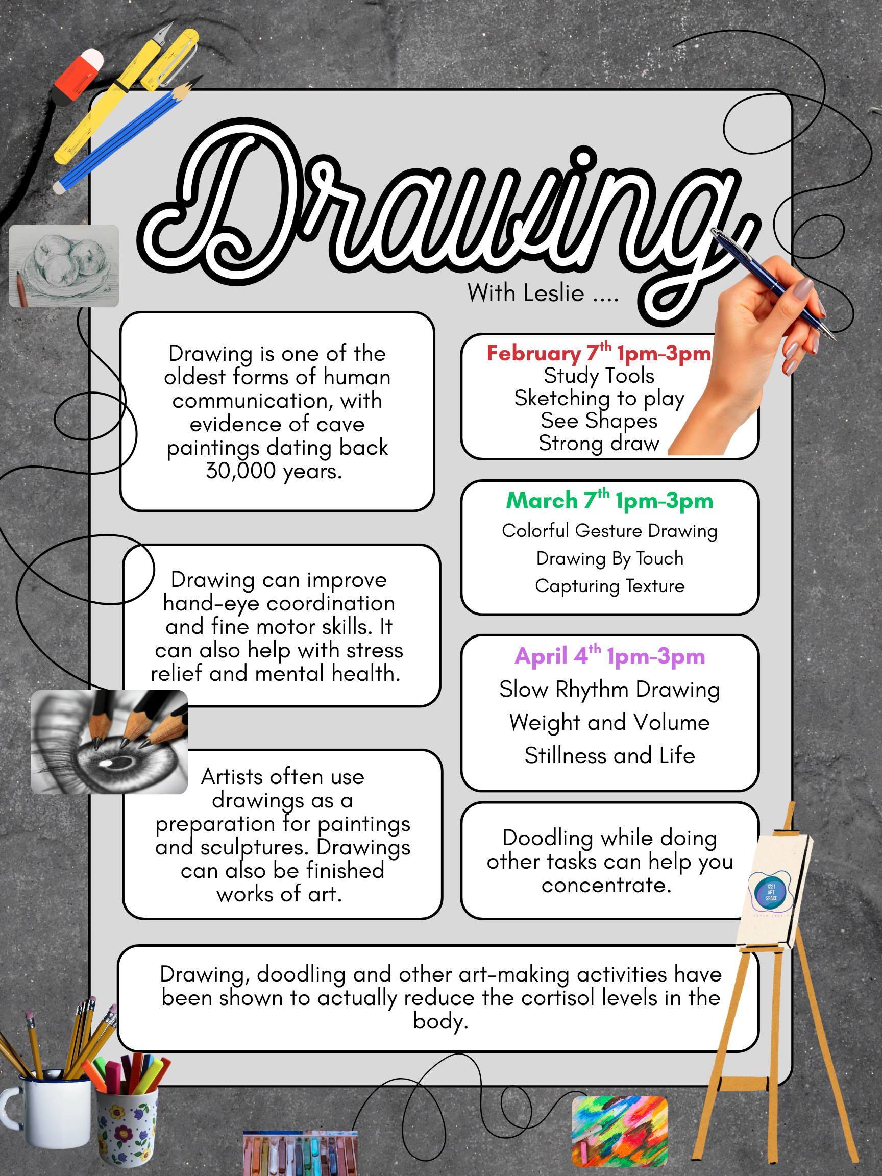 Introducing our new Saturday Class - Drawing with Leslie! Starting this Saturday, February 7th, from 1-3PM at 1221 Art Space. Email 1221artspace@concordcounseling.org if you have any questions.