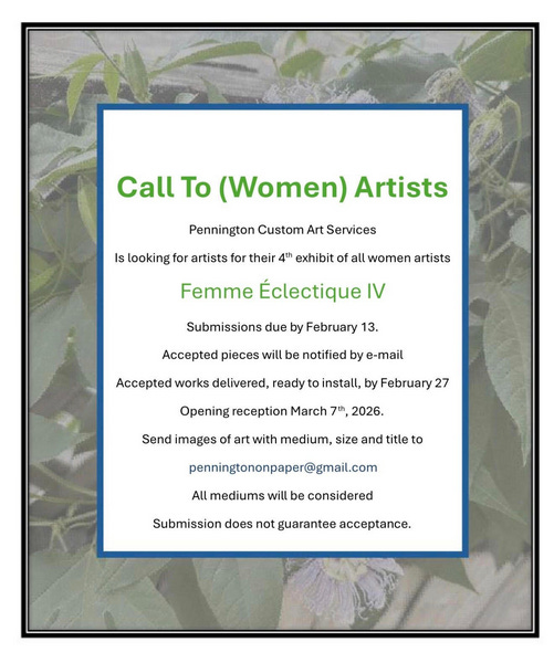 Pennington Custom Art Services is in search of women artists for their March (National Women's Month) exhibition.
