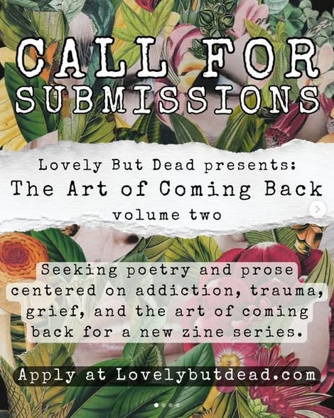 Lovely But Dead presents: The Art of Coming Back, a 10-part collaborative monthly zine series pairing Emily Morgan’s collage work with writing that explores addiction, grief, trauma, mental health, and recovery (aka the art of coming back).