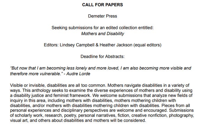 Please send inquiries and abstracts to editors: Lindsey Campbell & Heather Jackson (equal editors) at mothersanddisability@gmail.com