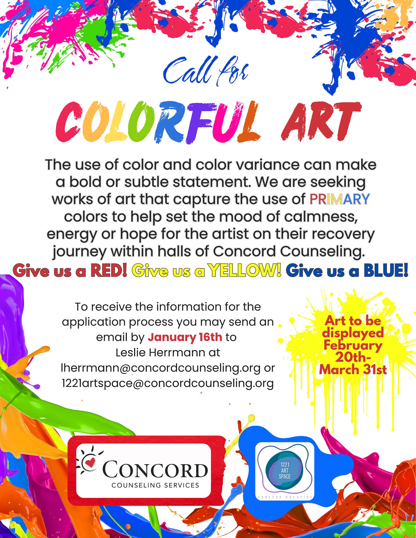 Call for Colorful Art! Do you have work that uses the primary colors red, blue, and yellow and encapsulates the feelings you have about color? This show will be displayed at Concord Counseling from February 20th to March 31st. We especially welcome those outside Franklin county! You must be a person who receives care at Concord Counseling. Please email Leslie for more information.